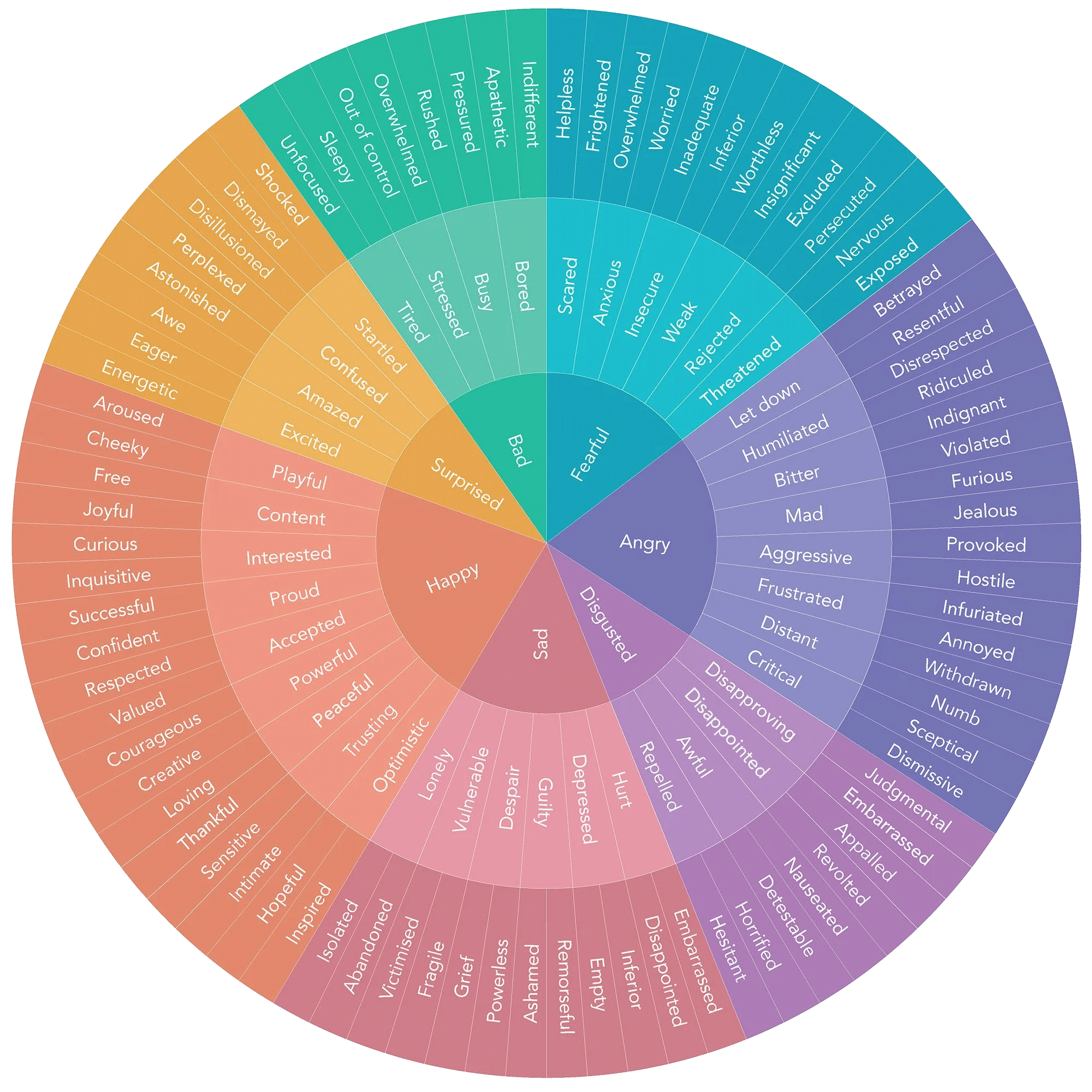 Another helpful tool is a feelings wheel (pictured above), which is like a pie chart divided into core emotions with increasingly specific language as it moves outward from the center. There are various iterations of a feelings wheel, with people putting different core emotions in the center and adding their own corresponding terms. A unique and helpful variation was created by therapist Lindsay Braman (linked at the top), which replaces the terms on the outer ring with corresponding bodily sensations. Yet another variation is Plutchik’s Wheel of Emotion (linked at the top), which names eight core emotions and explores their relationship to one another.